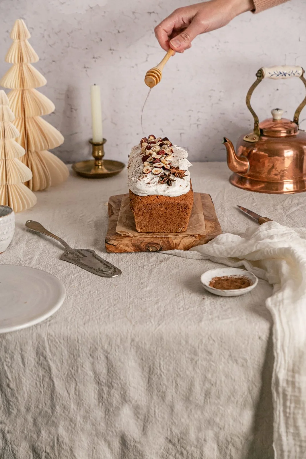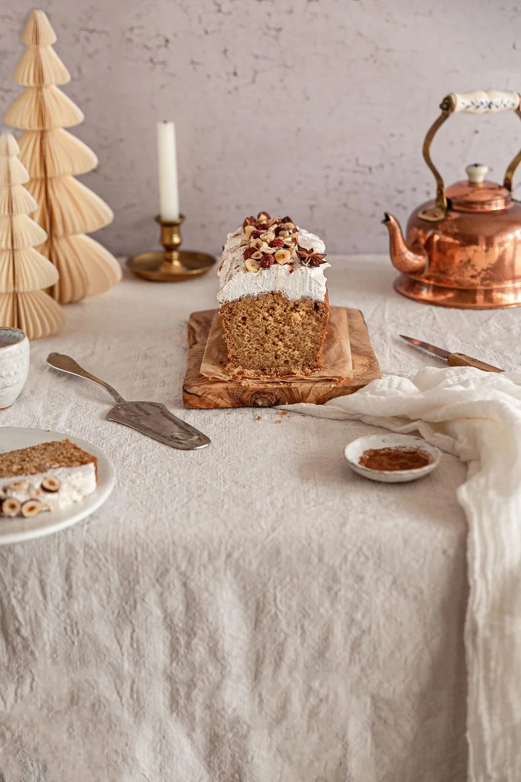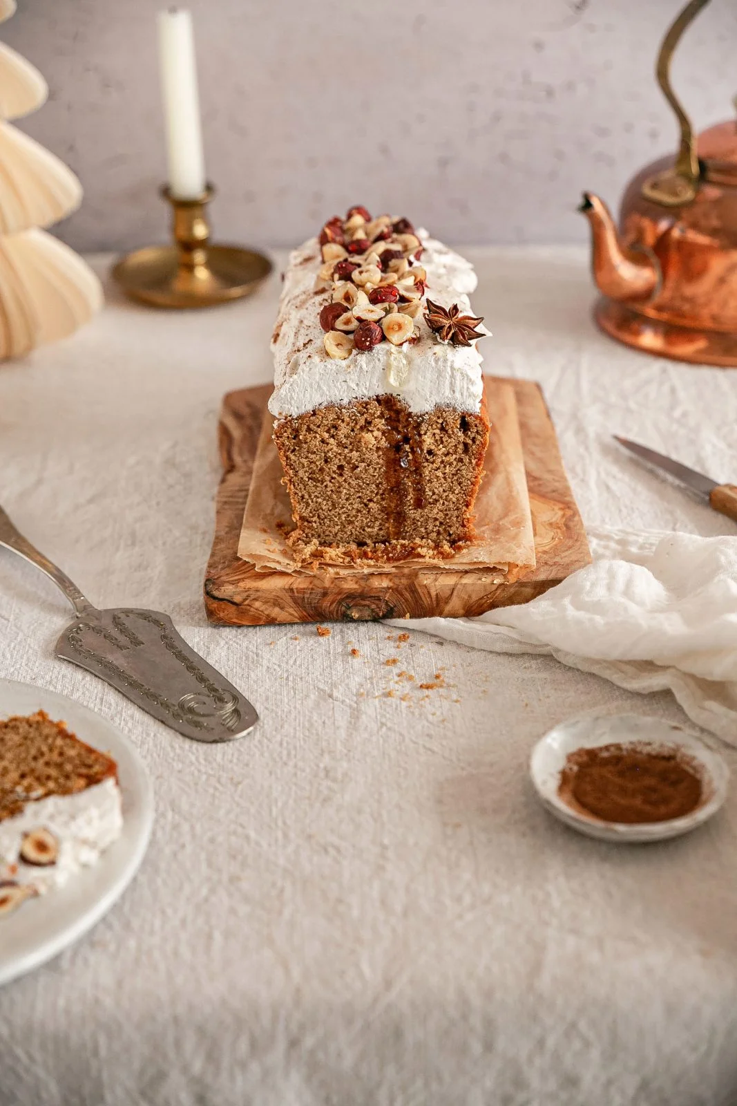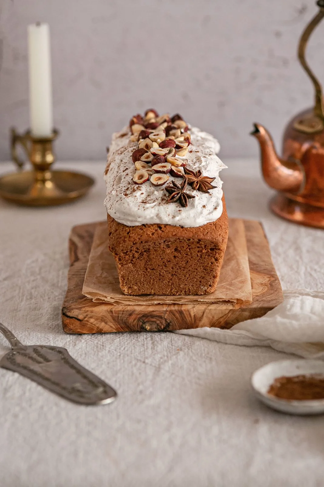 Quand je vous dit « hiver », « fêtes de Noël » vous pensez forcément au froid, à la neige et aussi à tout ce qui peut vous réchauffer : un bon plaid, une belle tasse de chocolat chaud, une bonne soupe et peut-être aussi un délicieux pain d’épice, vraie pâtisserie de saison ! Avec ses épices chaudes, son moelleux, il est d’un bon réconfort avec le froid de ces derniers jours. Et si j’ajoute que ce pain d’épice en plus d’être moelleux est vegan et très simple à faire, j’espère vous donner un peu plus envie de tester la recette. J’y ai ajouté une petite gourmandise supplémentaire avec cette chantilly sur le dessus, mais elle n’est qu’une option.